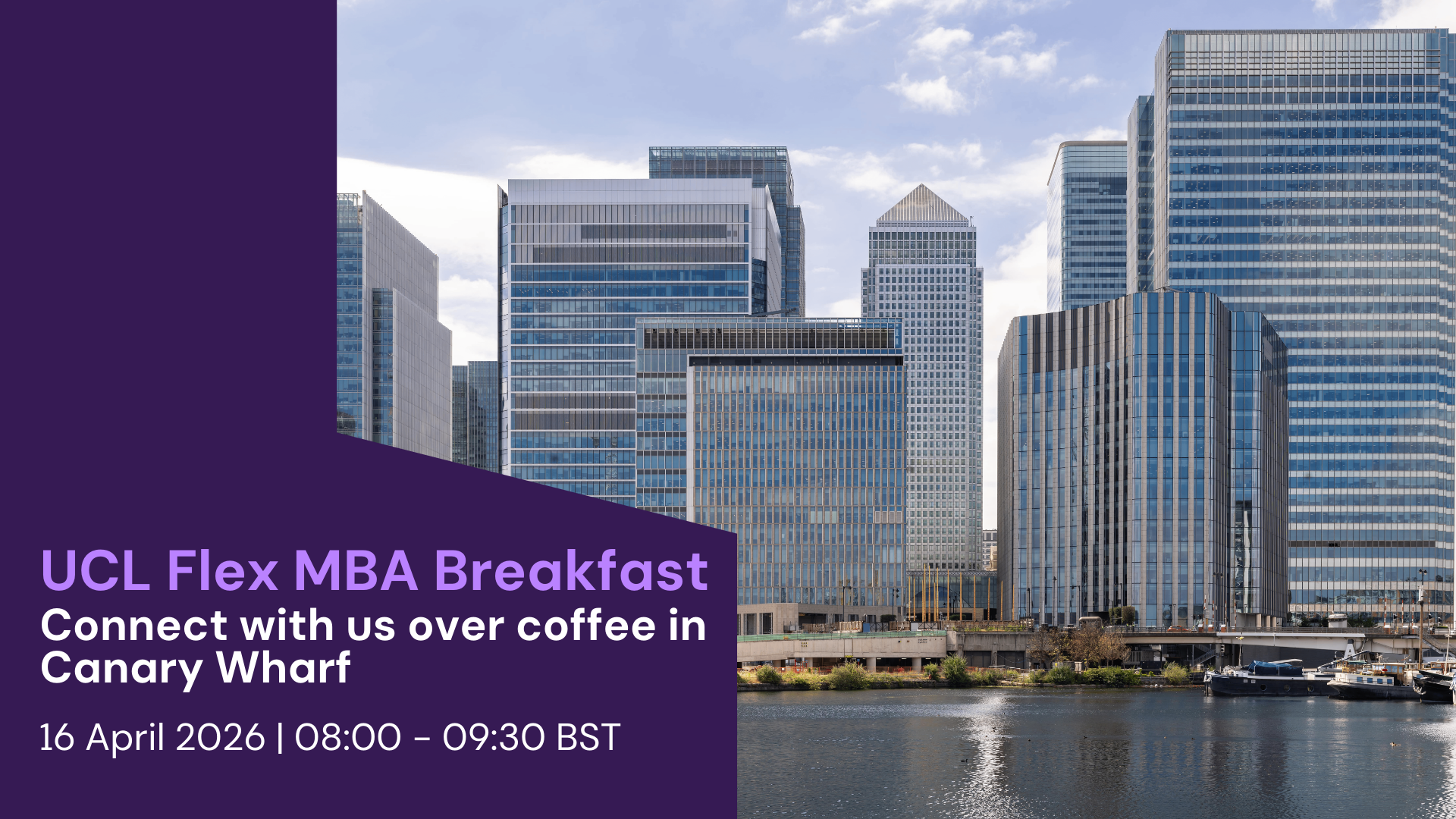 Join us at UCL’s Canary Wharf Campus in One Canada Square for an engaging morning dedicated to exploring the UCL Flex MBA experience. This breakfast session gives you the chance to discover how the programme works in practice, what flexible study looks like, and how it can fit around your professional and personal commitments whilst enhancing your career.